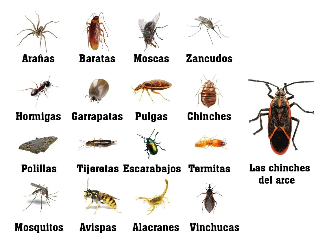 Controla eficazmente: Moscas, zancudos, baratas, hormigas, garrapatas, pulgas, chinches, avispas, arañas, vinchucas, alacranes, polillas, tijeretas, escarabajos, termitas, gorgojos y otros insectos voladores y rastreros.