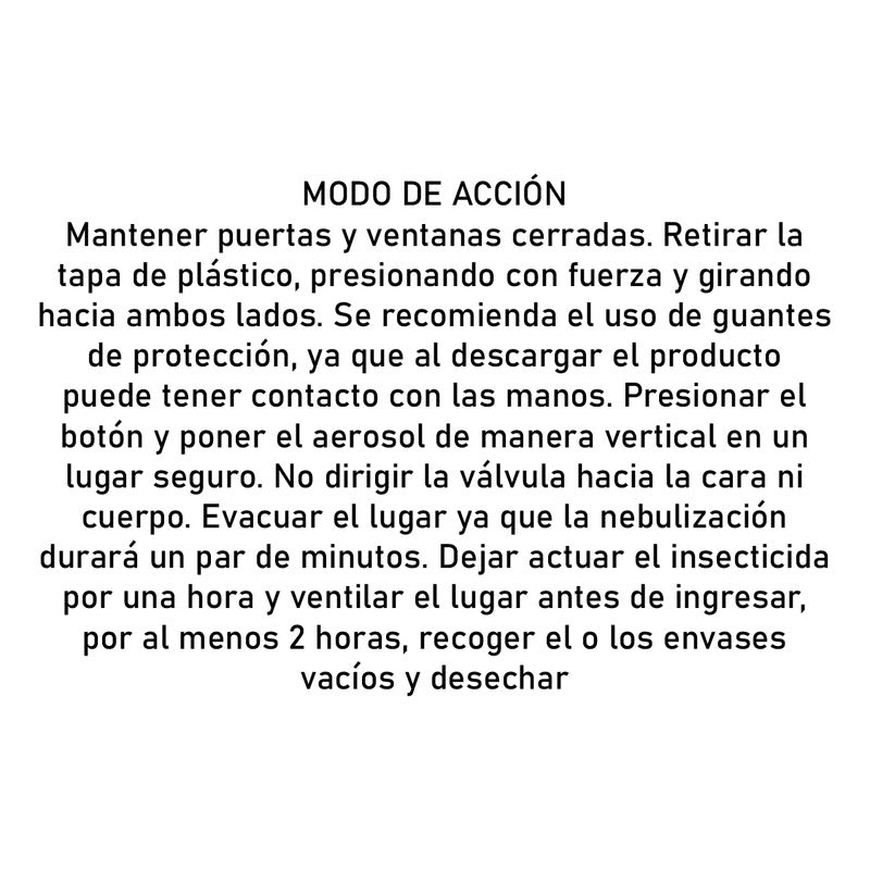 VOLADORES Y RASTREROS DESCARGA TOTAL, para el control en interiores del hogar de insectos y artrópodos como: moscas, mosquitos, polillas, arañas de rincón, pulgas, chinches y hormigas. Formulado con una alta concentración de principios activos de última generación, que le entregan eficacia inmediata. Es recomendado idealmente para lugares que se han mantenido cerrados por tiempos prolongados como entretechos, zócalos, cabañas de veraneo, etc. MODO DE ACCIÓN Mantener puertas y ventanas cerradas. Retirar la tapa de plástico, presionando con fuerza y girando hacia ambos lados. Se recomienda el uso de guantes de protección, ya que al descargar el producto puede tener contacto con las manos. Presionar el botón y poner el aerosol de manera vertical en un lugar seguro. No dirigir la válvula hacia la cara ni cuerpo. Evacuar el lugar ya que la nebulización durará un par de minutos. Dejar actuar el insecticida por una hora y ventilar el lugar antes de ingresar, por al menos 2 horas, recoger el o los envases vacíos y desechar. USO Lugares con altas cargas de insecto y que han permanecido cerrados por largos periodos. Restaurantes, cocinas, bodegas, hoteles, dormitorios, medios de transportes y en cualquier sitio cerrado que presenten plagas.