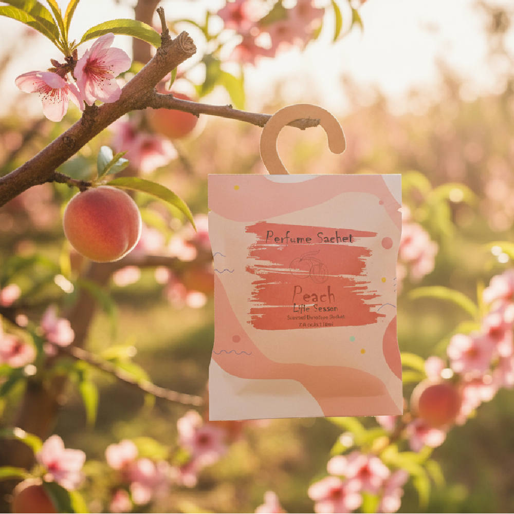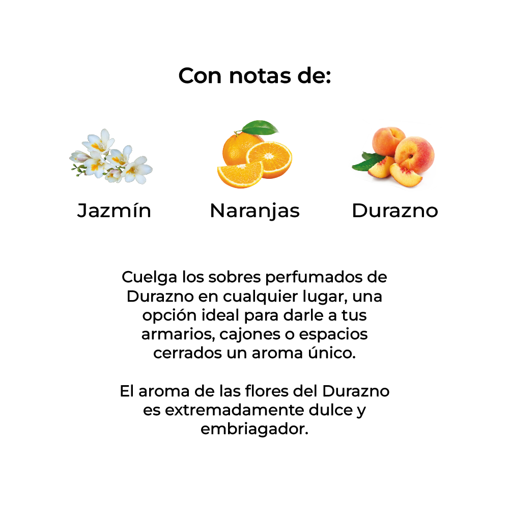 Un delicioso aroma a durazno maduro que te transporta a los huertos frutales en pleno verano. Este sobre perfumado de 15g impregna tu armario, auto o cajones con una sensación de frescura, dulzura y vitalidad, creando un ambiente alegre y acogedor dondequiera que lo coloques.