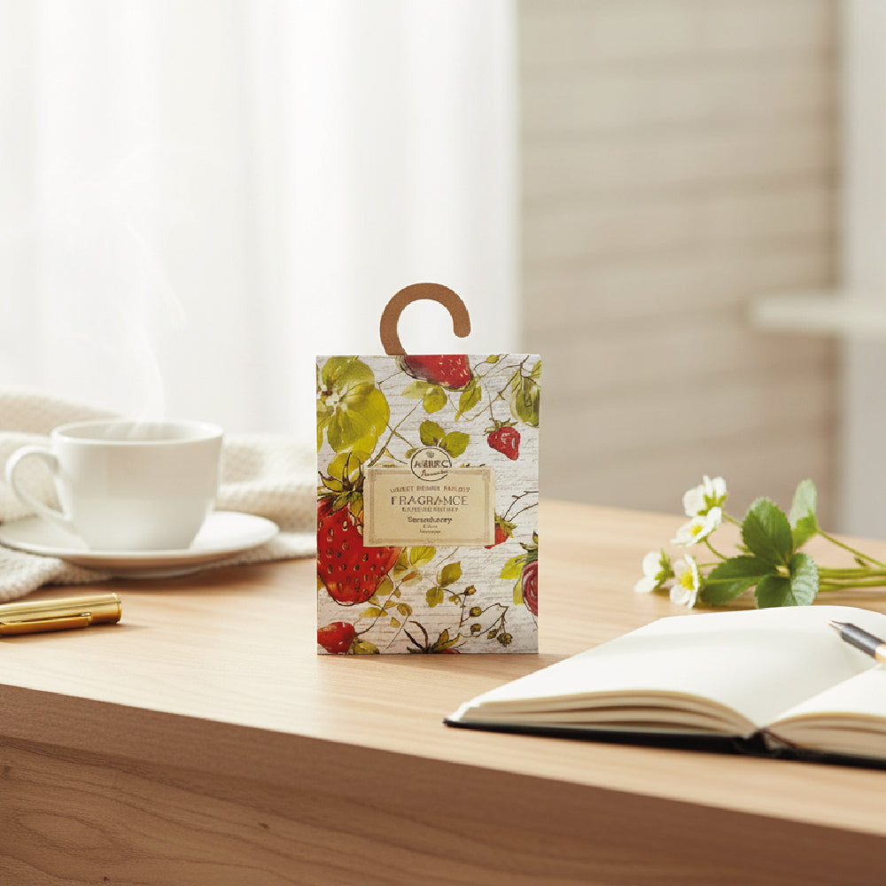 Un delicioso aroma a fresas frescas que te transporta a campos soleados en plena cosecha. Este sobre perfumado de 20g impregna tu armario, auto o cajones con una sensación de frescura, alegría y vitalidad, creando un ambiente dulce y acogedor dondequiera que lo coloques.