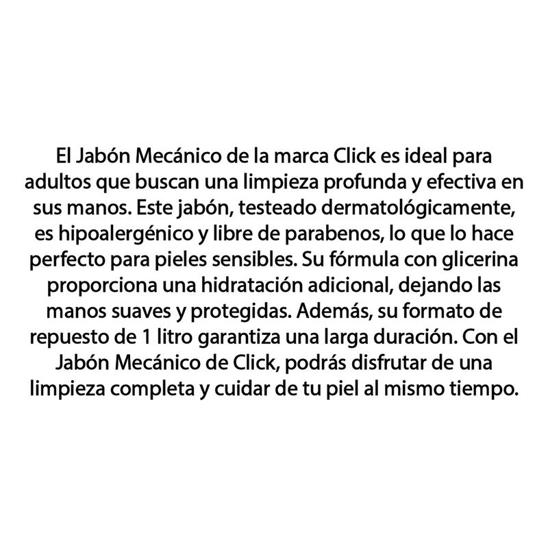 El Jabón Mecánico es ideal para adultos que buscan una limpieza profunda y efectiva en sus manos. Este jabón, testeado dermatológicamente, es hipoalergénico y libre de parabenos, lo que lo hace perfecto para pieles sensibles. Su fórmula con glicerina proporciona una hidratación adicional, dejando las manos suaves y protegidas. Además, su formato de repuesto de 1 litro garantiza una larga duración. Con el Jabón Mecánico , podrás disfrutar de una limpieza completa y cuidar de tu piel al mismo tiempo.