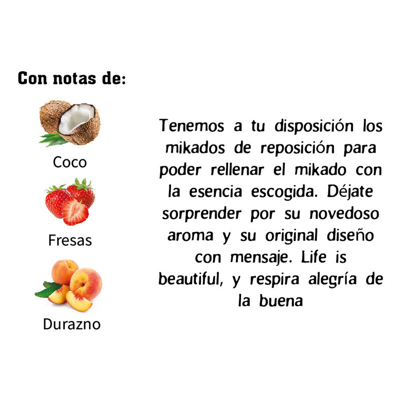 Mikado Aromatizador Repuesto pink 100ml + Varitas Pon en tu casa este bonito envase de mikado con aroma a Pinky Cloud…. un aroma de nubes rosas, un recuerdo a esos bellos atardeceres de terraza y amigos, o a esos amaneceres en la playa que nos muestra lo bonita que es la vida…… Regala o regalate a ti misma este bonito mikado y cuando entres a casa notarás que Life is Beautiful Notas de Salida: Fresa, Mantequilla Notas de Cuerpo: Nata, Fresa, Coco, Melocotón Notas de Fondo: Azúcar Tostado, Vainilla