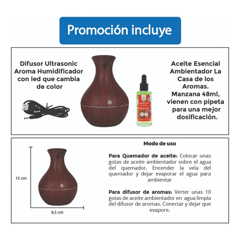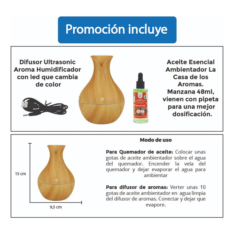 Difusor De Aroma Luz Led Usb 200 Ml + Aceite Manzana 50 Ml